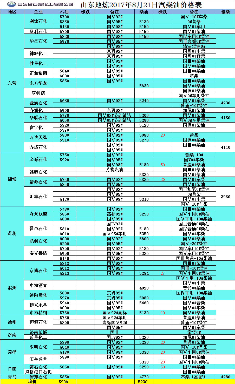 山東地?zé)?017年8月22日汽柴油價格表
