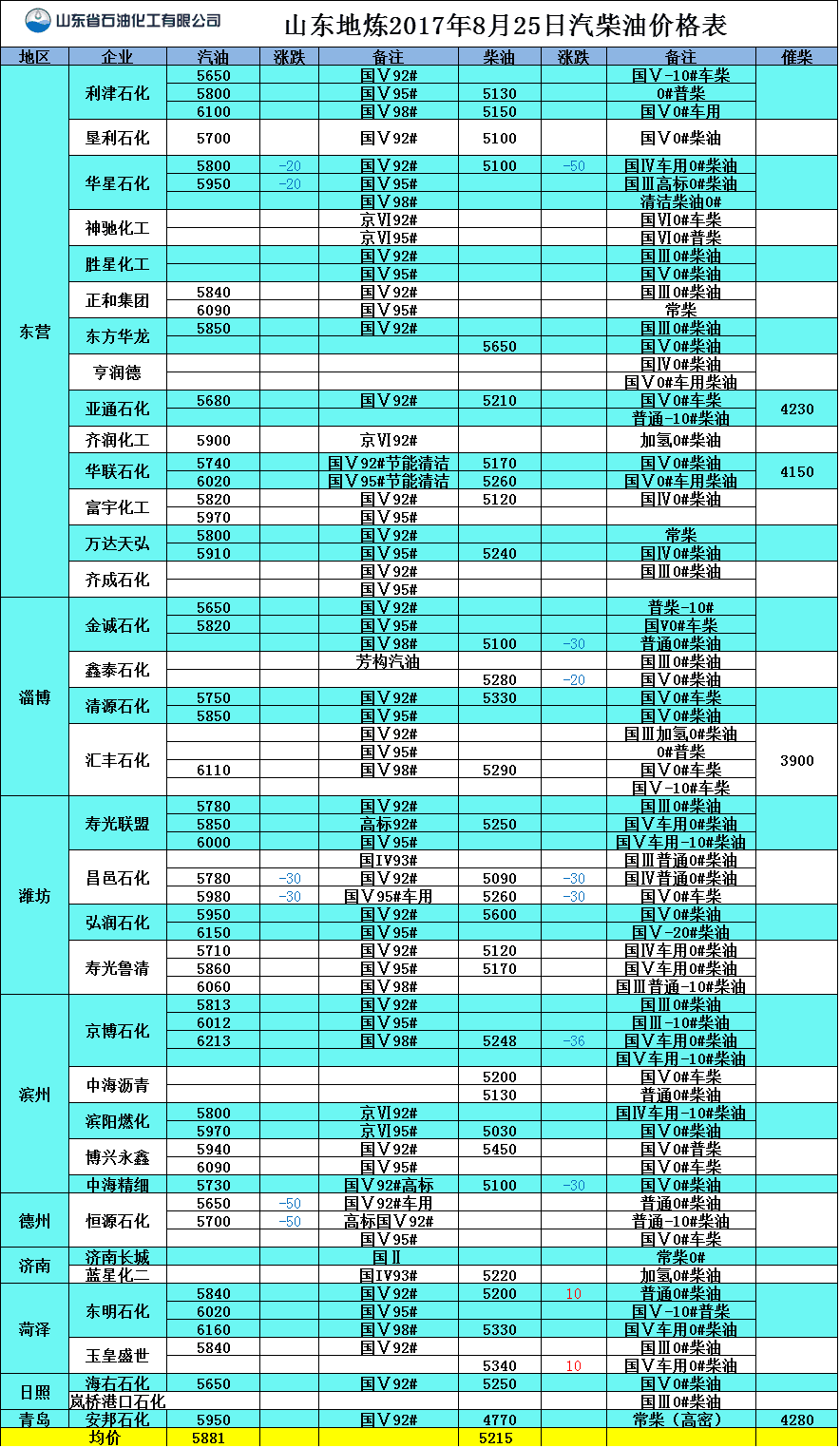 山東地?zé)?017年8月25日汽柴油價格表