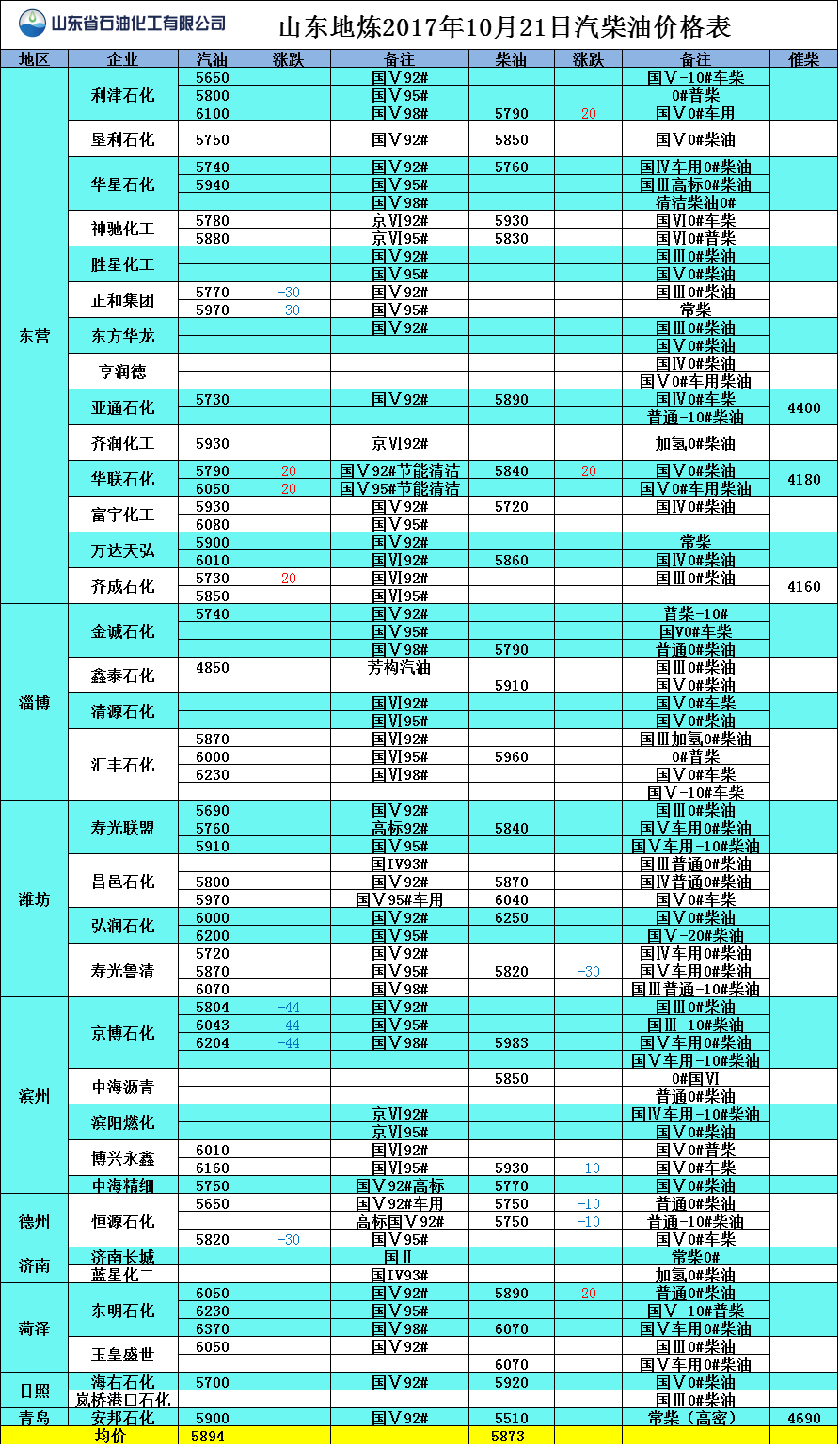 山東地?zé)?017年10月21日汽柴油價(jià)格表