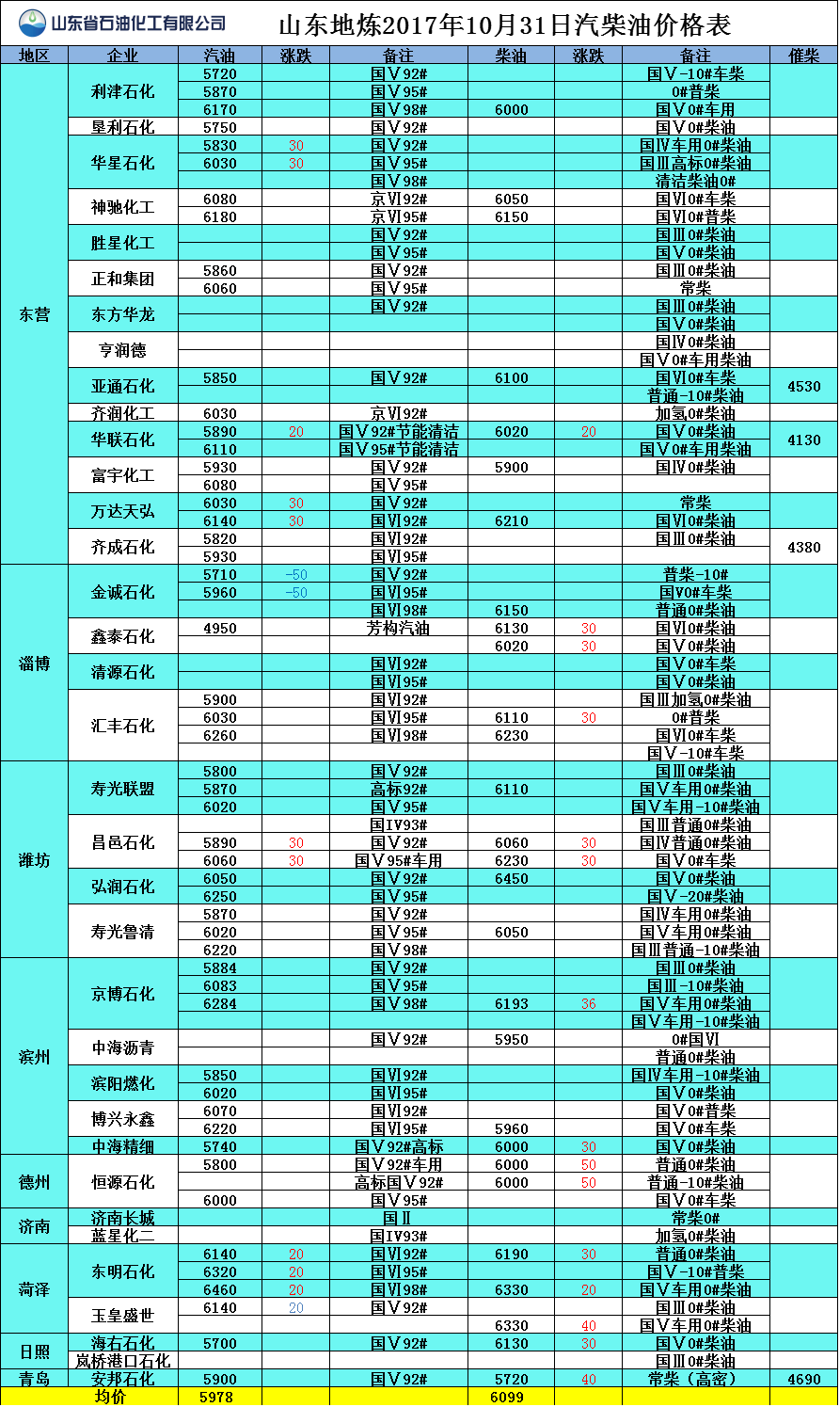 山東地?zé)?017年10月30日汽柴油價(jià)格表