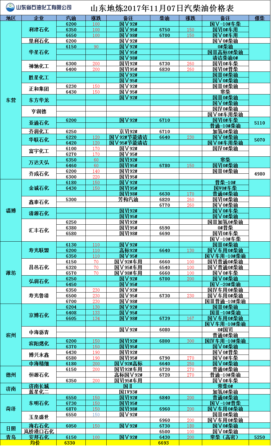 山東地煉2017年11月7日汽柴油價格表