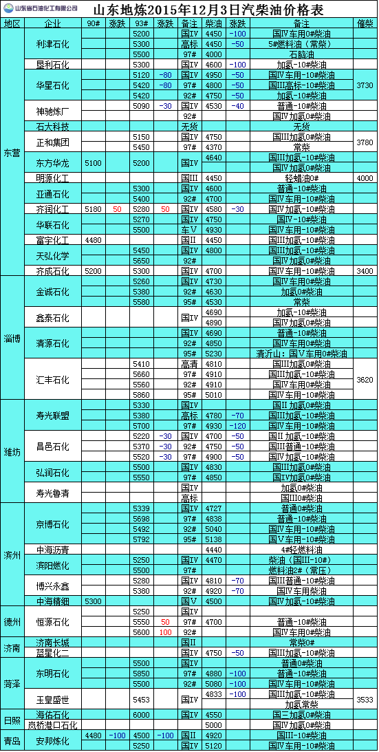 2015年12月3日山東地煉汽柴油價格表