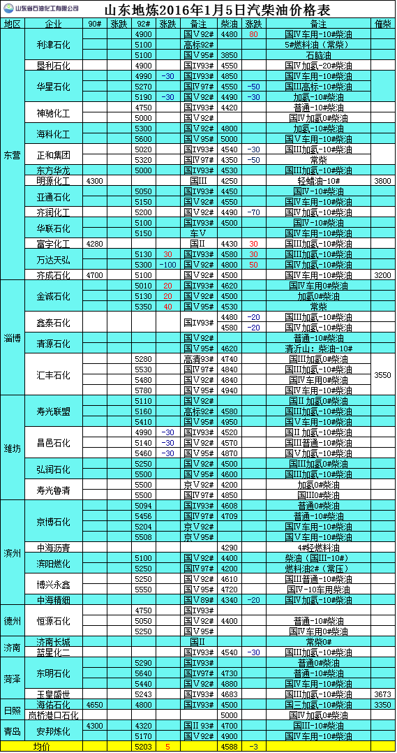 2016年1月5日山東地?zé)捚裼蛢r格表