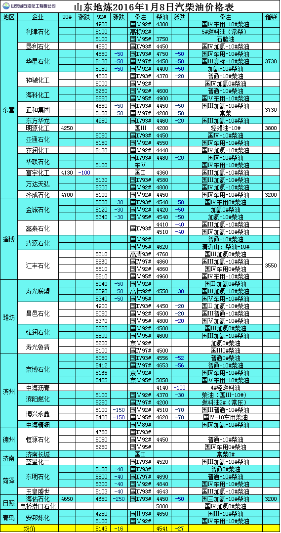 2016年1月11日山東地?zé)捚裼蛢r格表