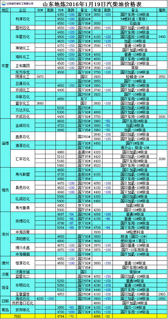 2016年1月19日山東地?zé)捚裼蛢r格表