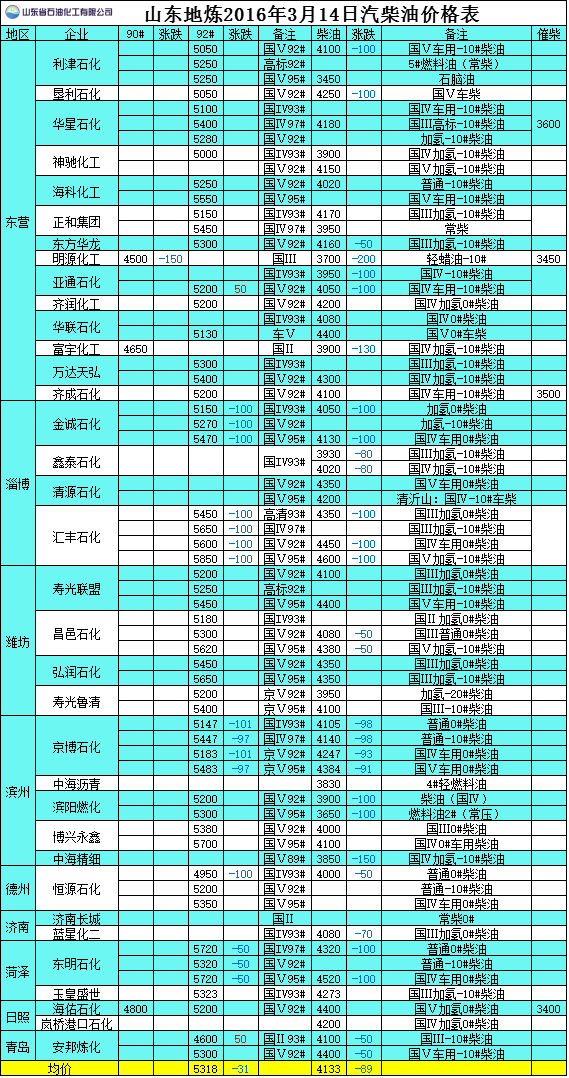 2016年3月14日山東地?zé)捚裼蛢r格表