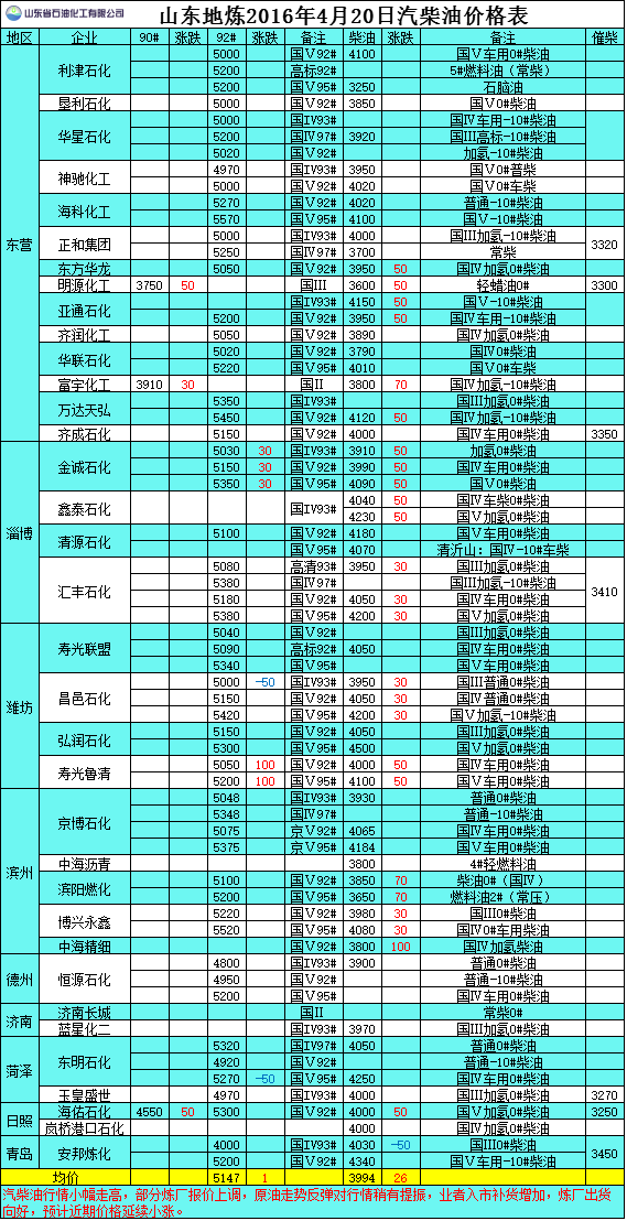 2016年4月20日山東地?zé)捚裼蛢r格表