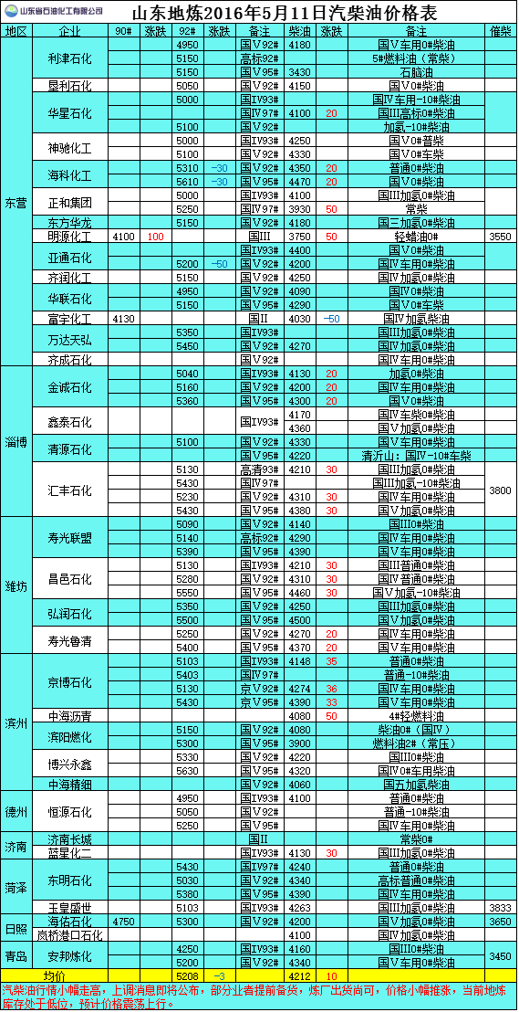2016年5月11日山東地煉汽柴油價格表