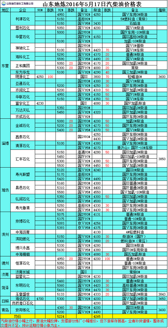2016年5月17日山東地煉汽柴油價格表
