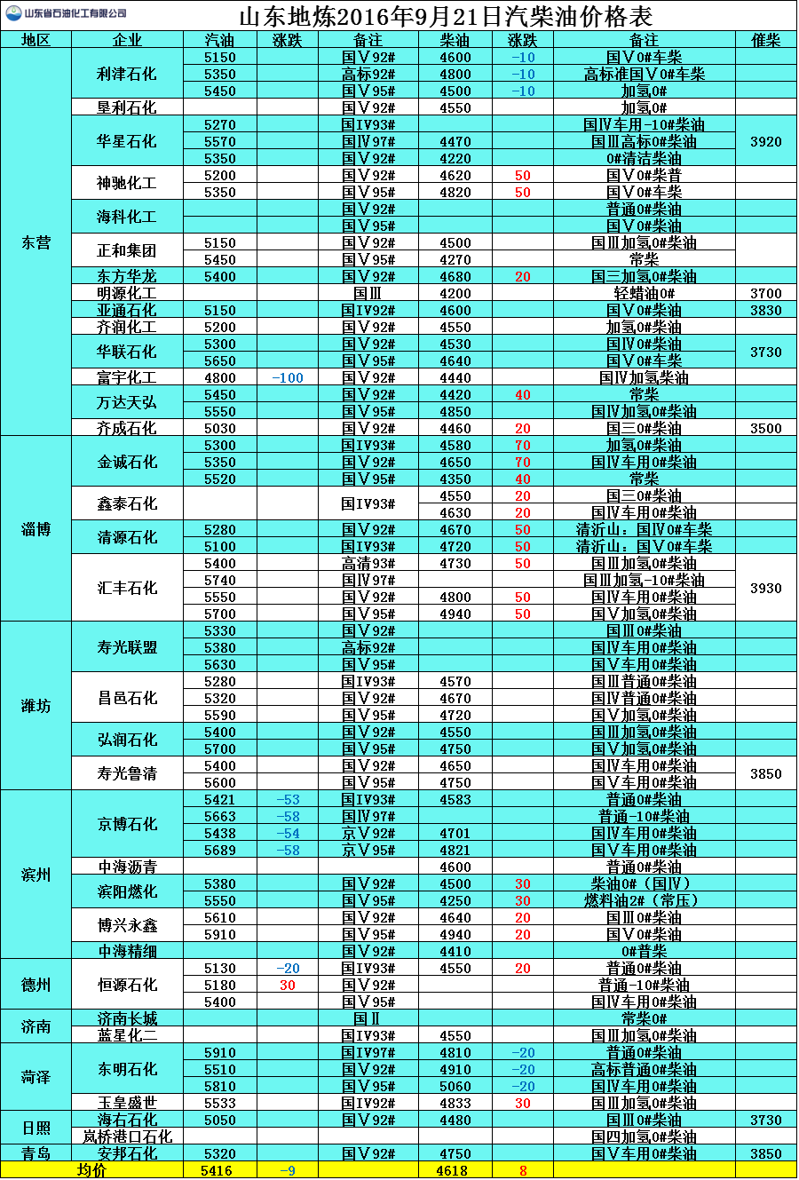 9月20日山東地煉汽柴油價格