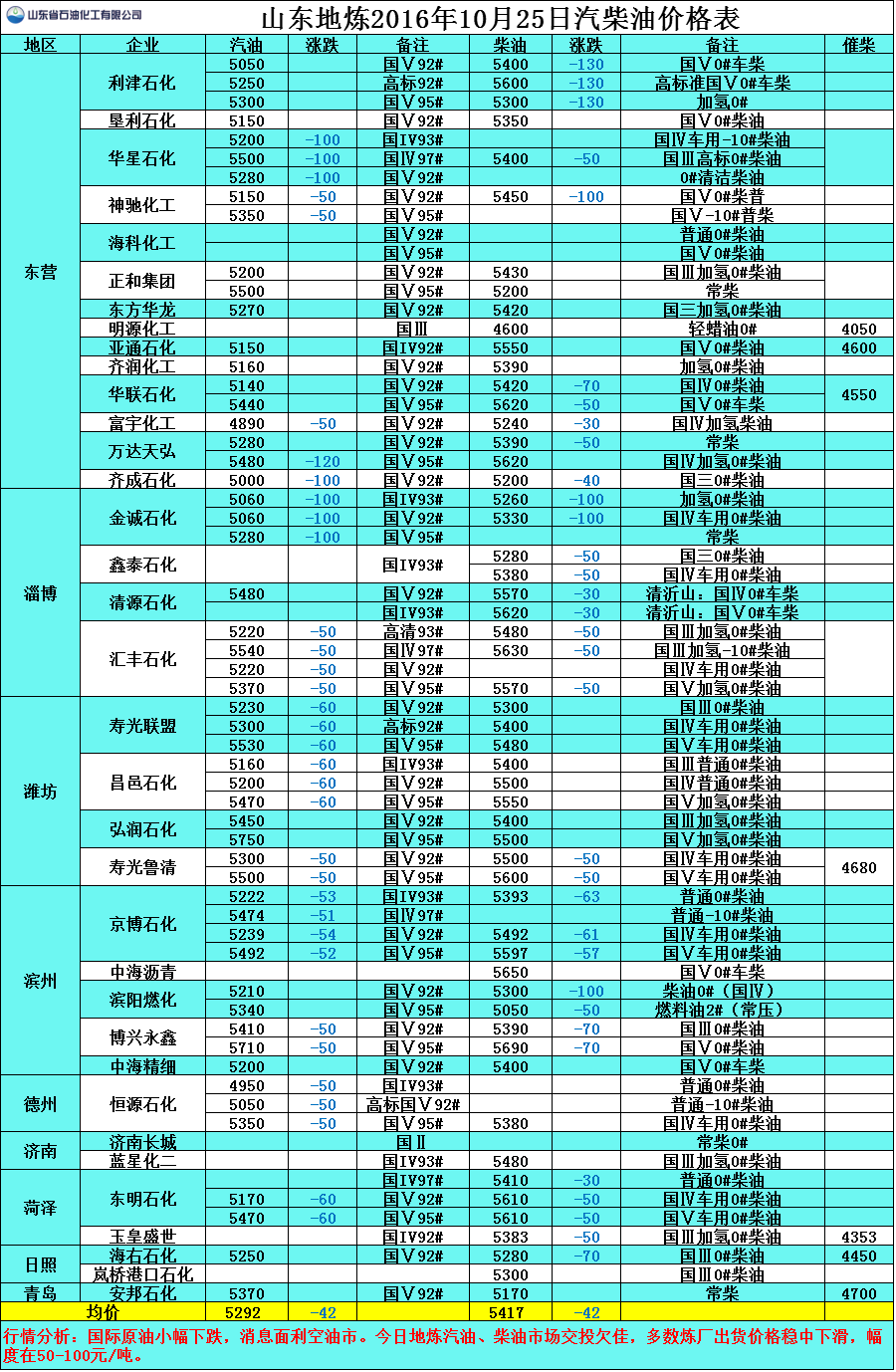 行情分析:國(guó)際原油小幅下跌,消息面利空油市。今日地?zé)捚?、柴油市?chǎng)交投欠佳,多數(shù)煉廠出貨價(jià)格穩(wěn)中下滑,幅度在50-100元/噸。
