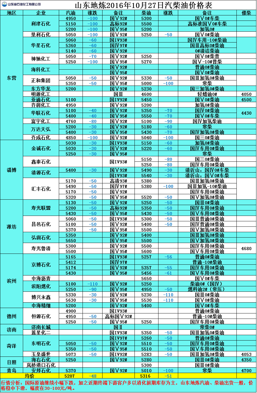 10月26日山東地煉汽柴油價格