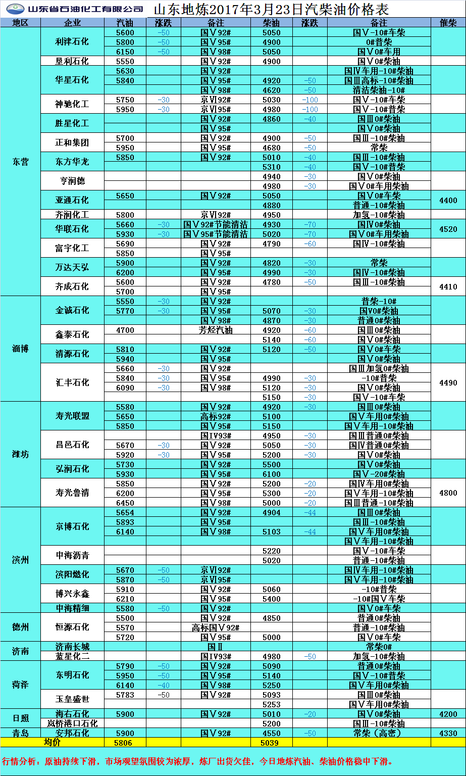 2017年3月23日山東地煉汽柴油價格