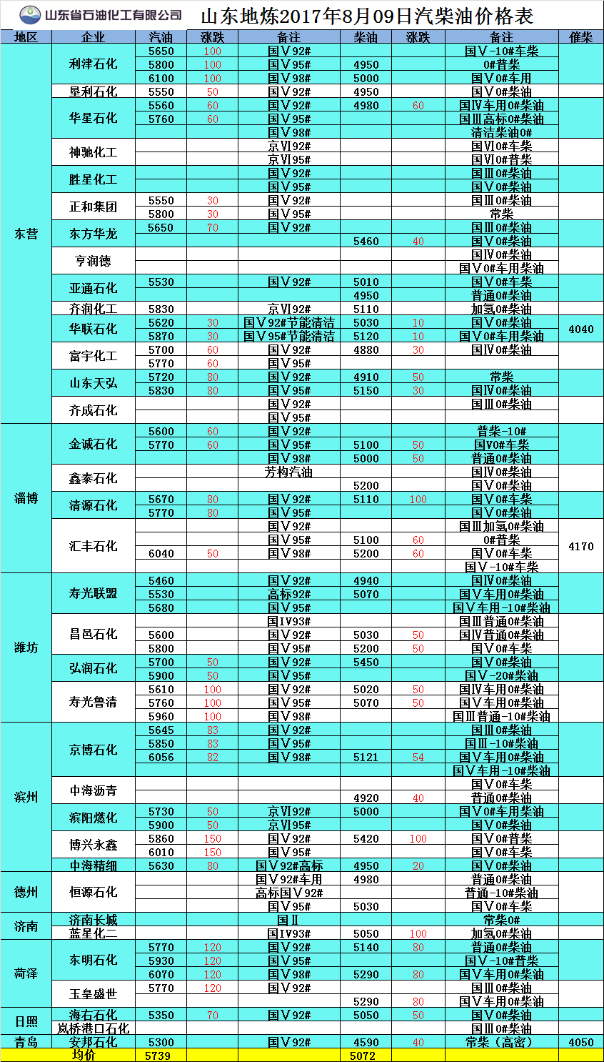 山東地?zé)?017年8月10日汽柴油價(jià)格表
