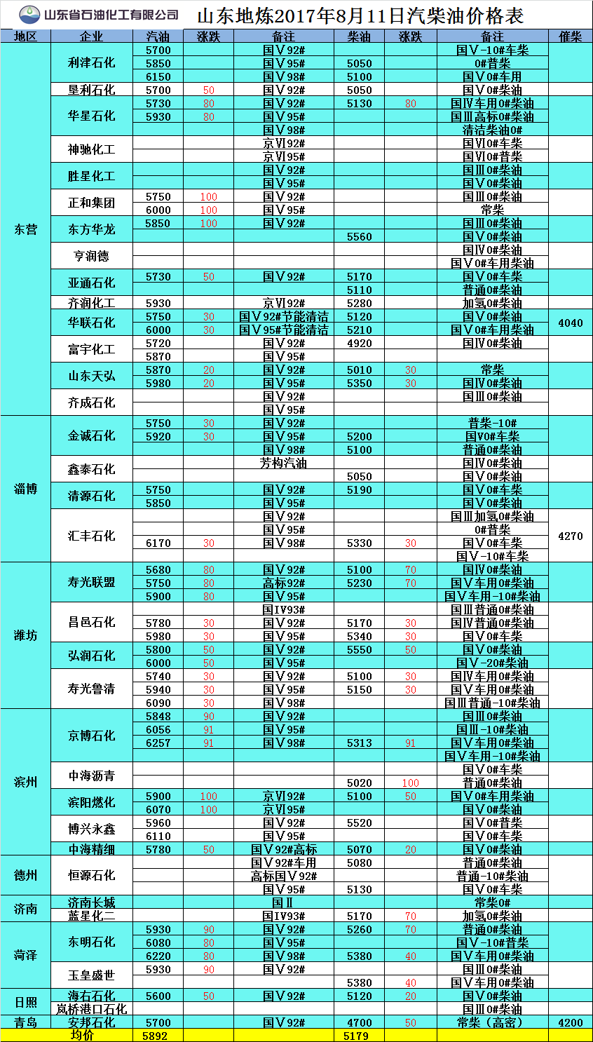 山東地?zé)?017年8月11日汽柴油價(jià)格表